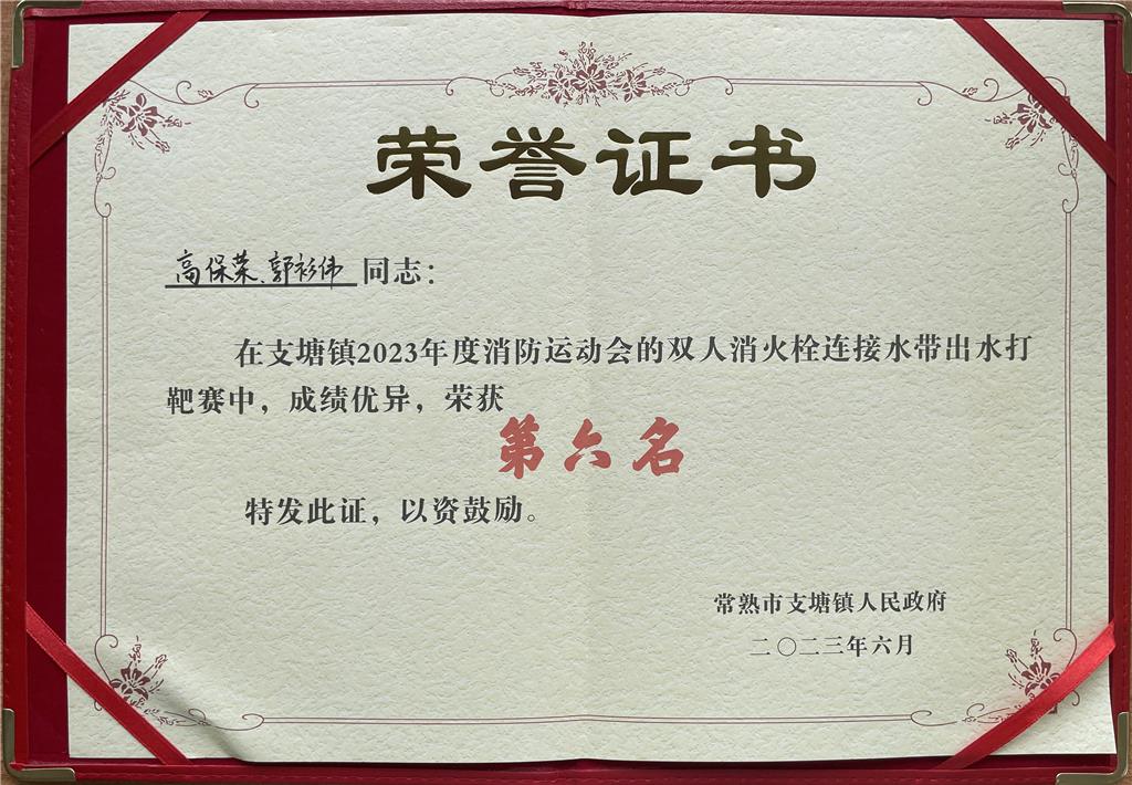 在比赛中,大家奋力拼搏,齐心协力,以饱满的热情,积极的心态取得了好成绩。项桥村获得团体第一名,倪艳菊在灭火器使用及火盆灭火女子赛中获得第二名,韩国清在消防救援服着装赛中获得第五名,高保荣、郭衫伟在双人消火栓连接水带出水打靶比赛中获得第六名。