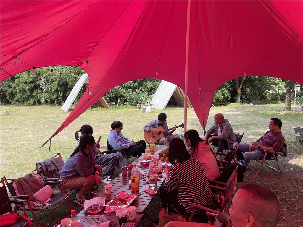 没有 “领导”“下属”的拘谨,只有 “你刷油,我看火”的分工合作。有人负责给肉串刷油,有人忙着翻动烤得滋滋冒油的鸡翅,还有人端着刚烤好的烤肠到处 “投喂”,整个现场热闹得像过年聚餐。最令人惊喜的是,供应链总监带来了吉他弹唱,悠扬的旋律伴着美食的香气,在湖光山色间缓缓流淌。