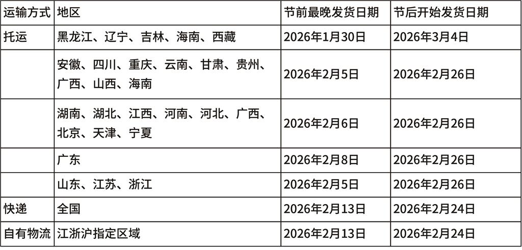 由于各地货运公司假期安排不同,最终到货时间以当地货运公司安排为准,如有送货延迟情况,敬请谅解。如有任何疑问,欢迎致电0512-52549999询问客服人员。