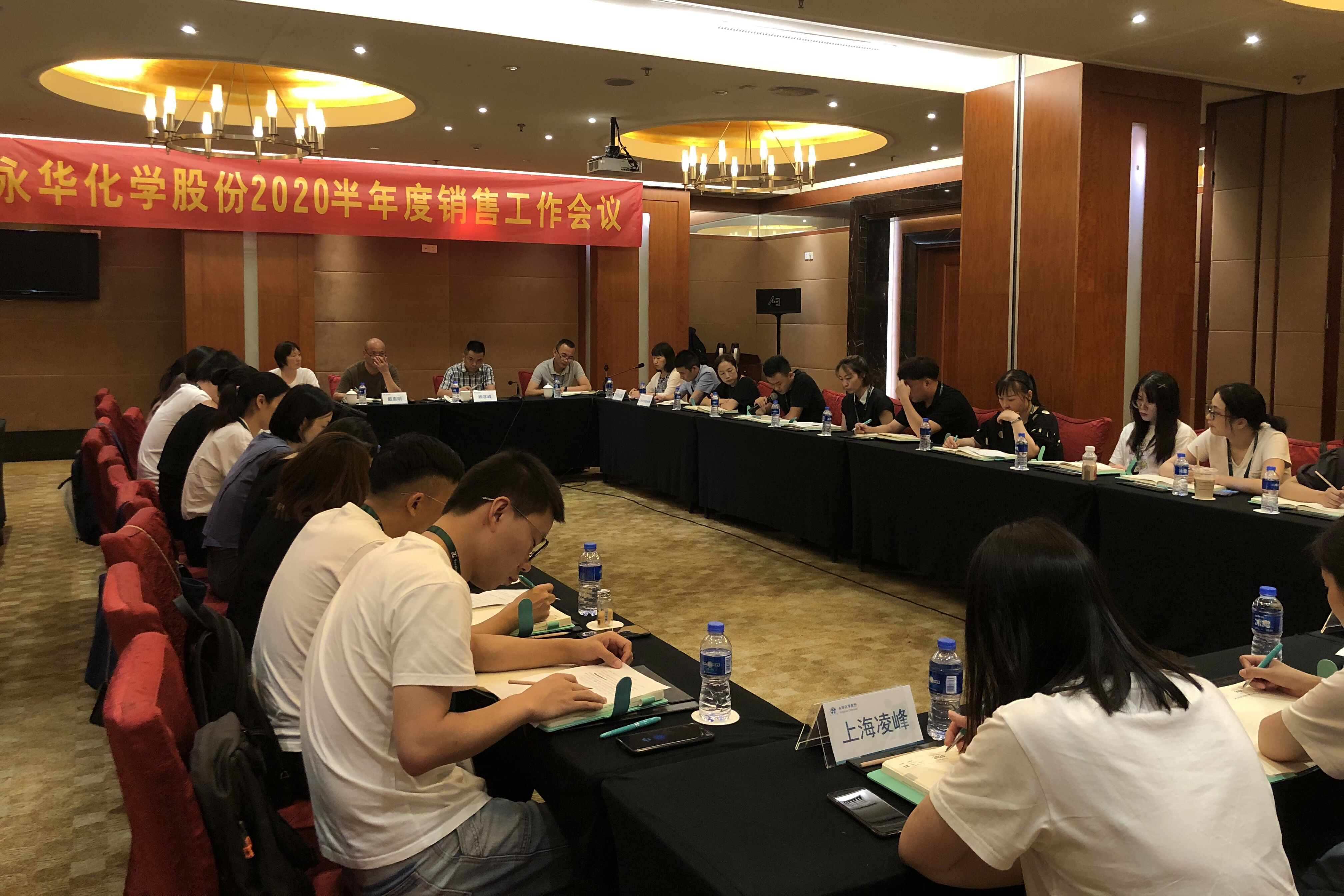7月19日,我司2020上半年度销售工作会议在裕坤国贸酒店召开,公司总经理顾学峰,常务副总戴惠明,供应链副总张丽萍,销售副总周军,各销售部所有员工及部分工厂领导参会,会议由陈书平主持召开。