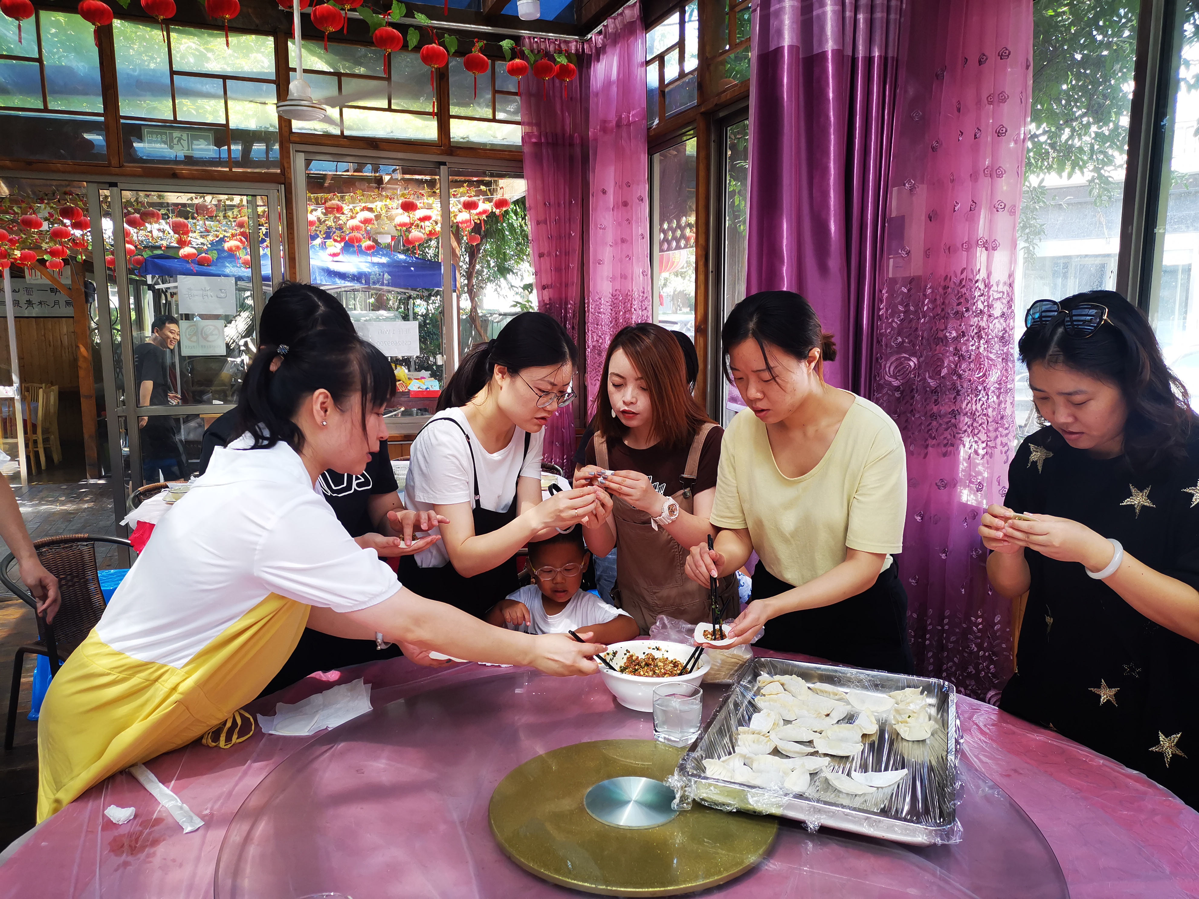 还有一部分人留在茶室,一起包饺子。茶室老板早早的准备了馅料、饺子皮,各个部门的同事也都跃跃欲试,各显本事。不会包的同事也不忘认真请教,不过一会就已经学会了。一只只饺子就这样从大家的巧手中捏出来了,摆满了一桌。