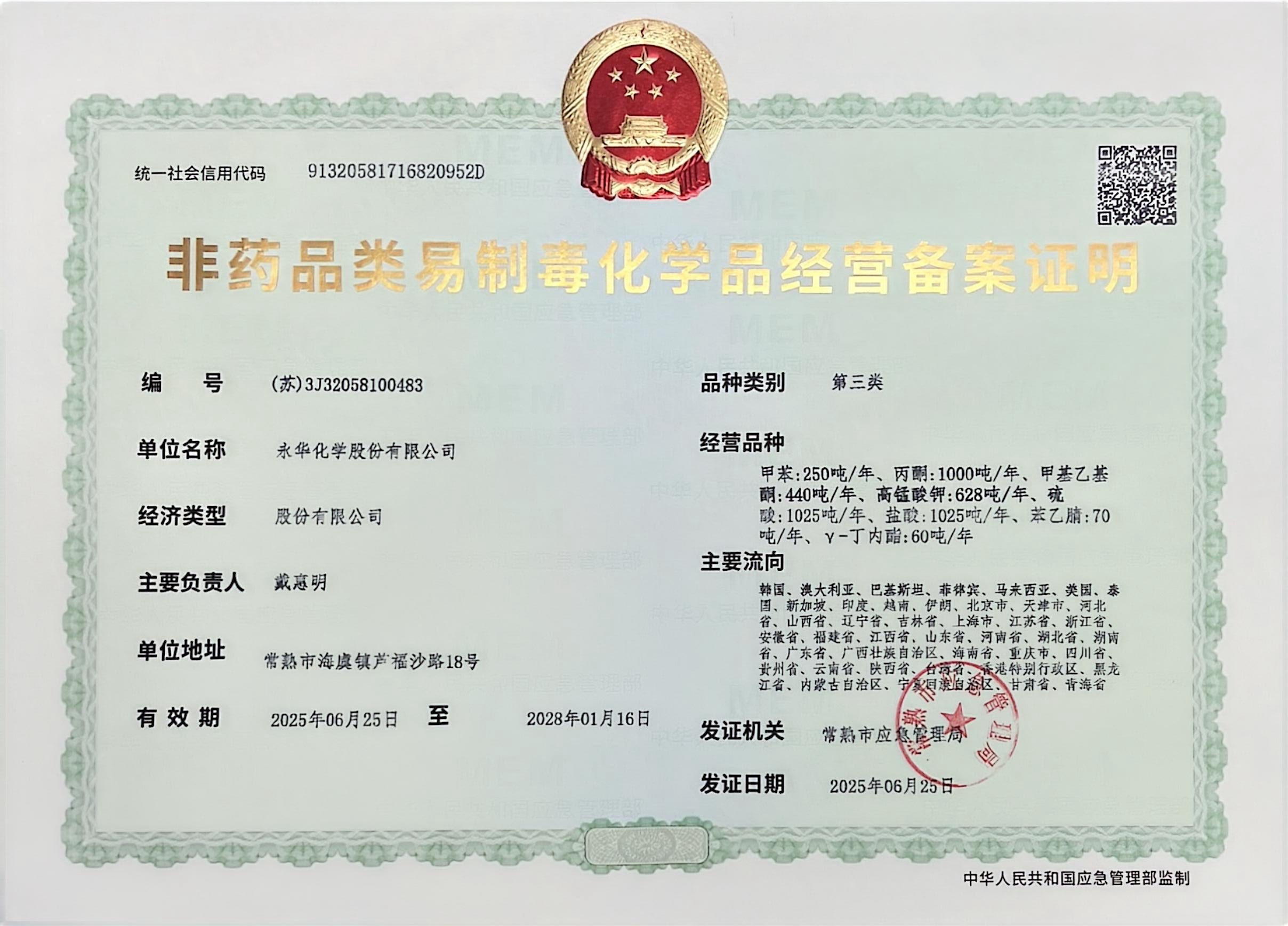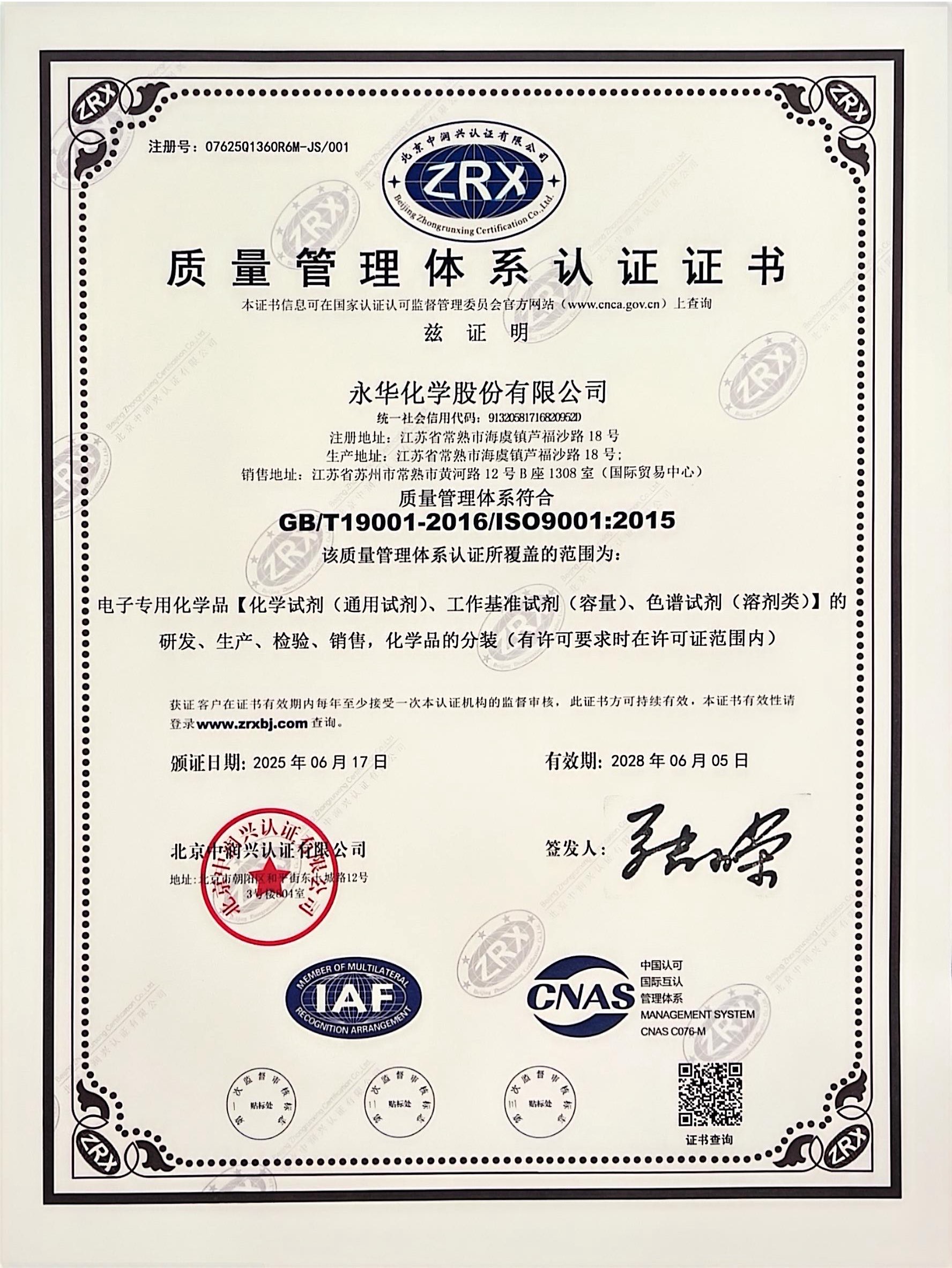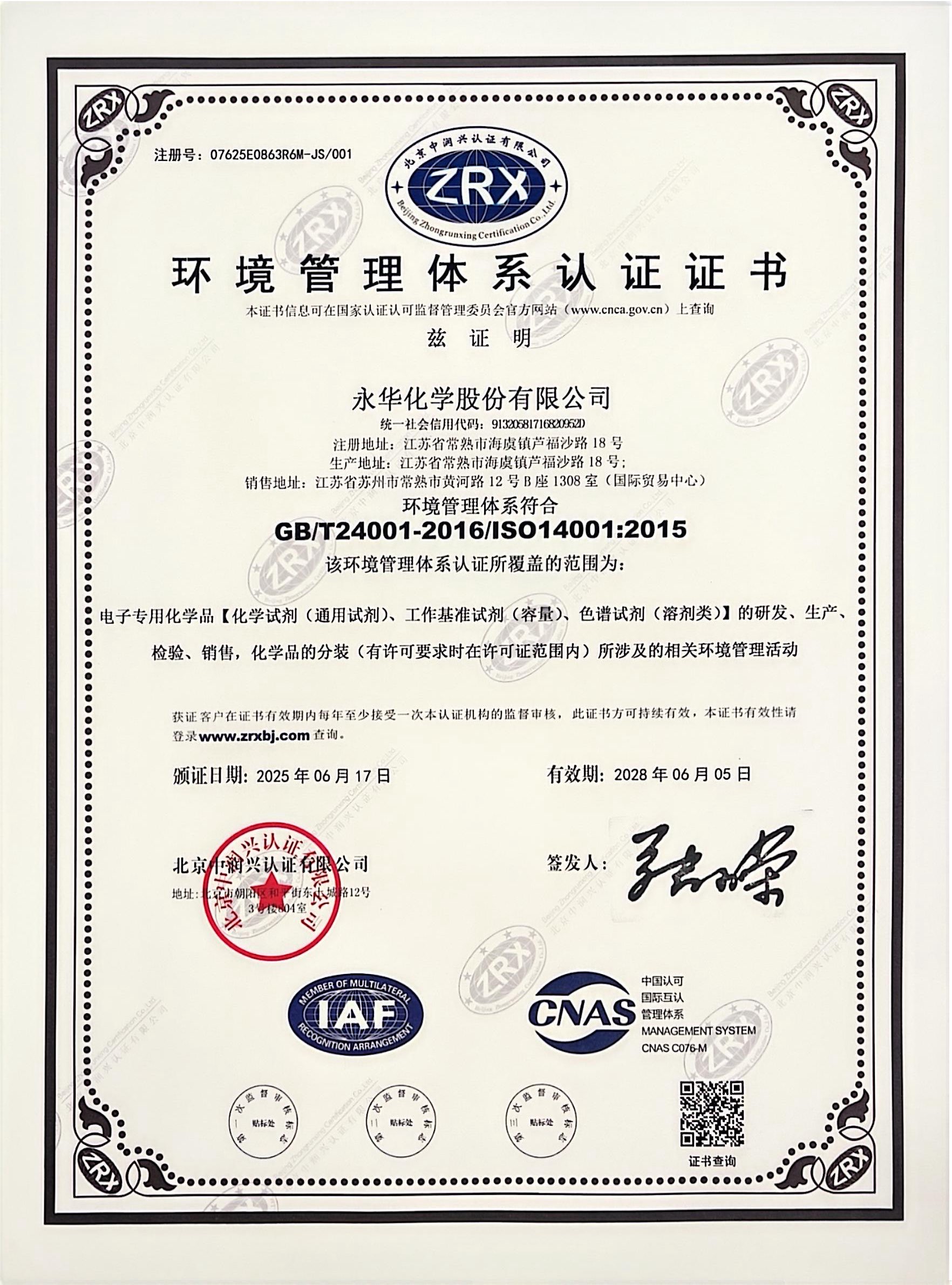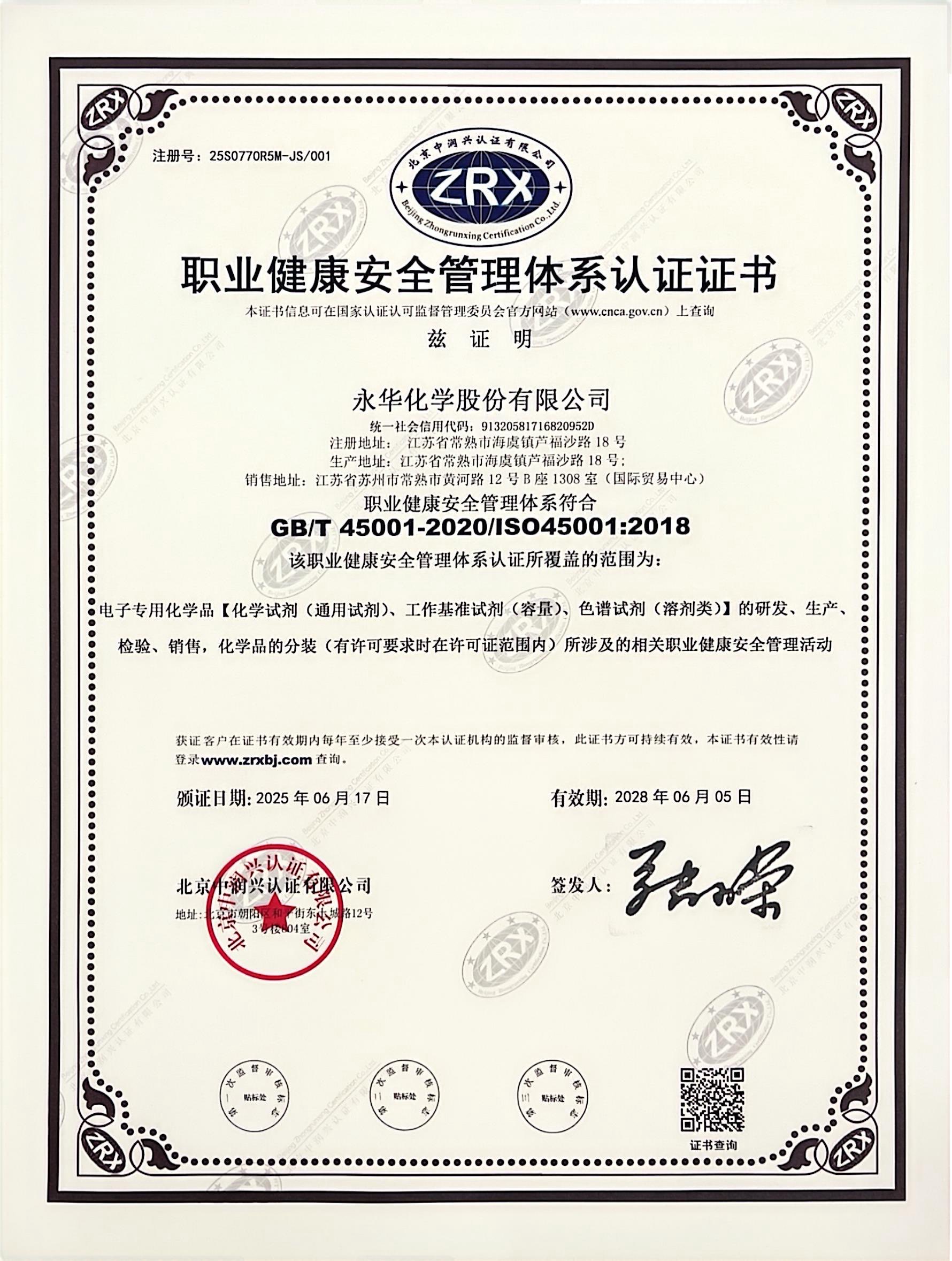 公司不仅通过了质量管理ISO9001:2015、环境管理ISO14001:2015、职业健康安全管理ISO45001:2018三体系认证,还成功通过英国BV审计公司的质量、道德审计及安全生产标准化二级企业(危化)的审核。同时,公司深化产学研合作,与苏州大学合作设立研究生工作站。